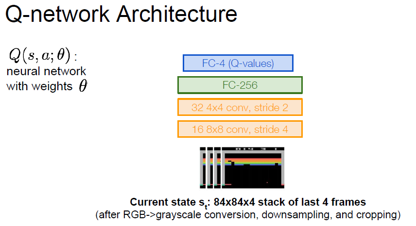 最终生成四个值, 分别为上下左右的Q value. 我们使用最近的四帧来预测Q value.